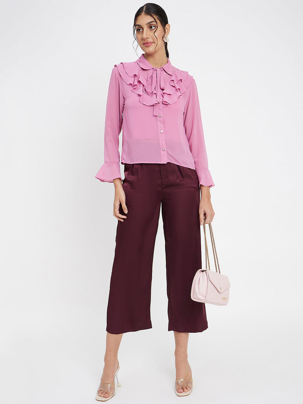 Elevate your fashion with the delightful addition of Madame Solid Pink Top in your wardrobe.