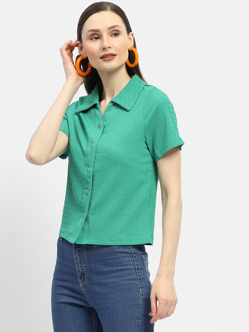 Add style to your casual wardrobe with this Textured Green Half Sleeve Shirt. This shirt is comfortable and stylish, made of high-quality textured fabric in a pleasant green. The texture gives the shirt depth and interest, distinguishing it apart from other shirts. This shirt's half-sleeve style makes it adaptable for layering under a jacket or wearing alone on warmer days.