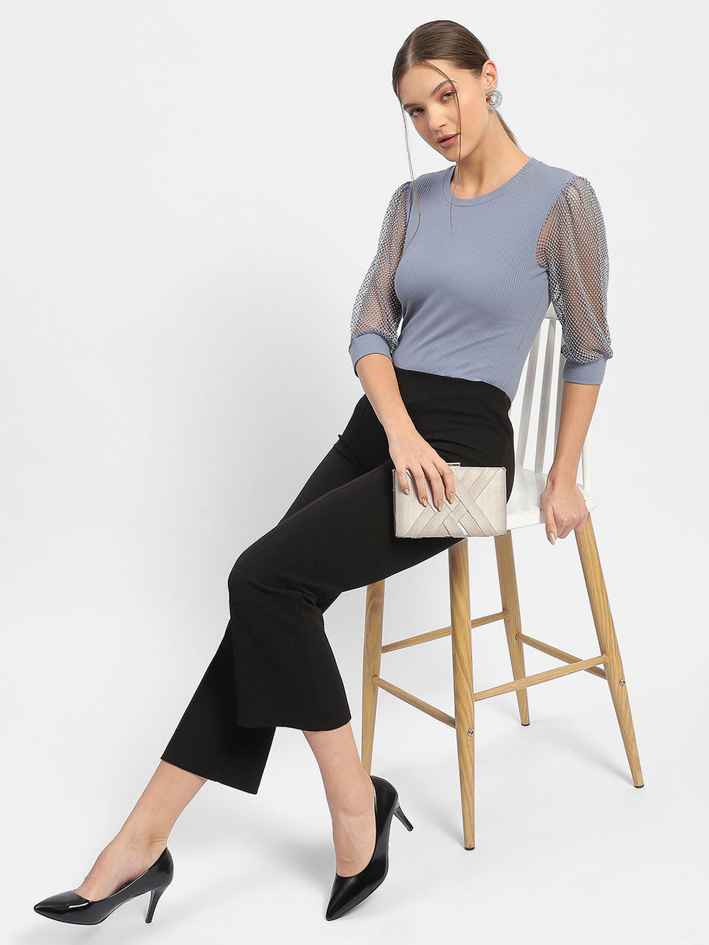 Our comfort-chic knit sleeve grey regular top is excellent for everyday wear. This silky knit top has contrasting knit sleeves that give texture and visual interest to the basic pattern. The grey colour matches any bottoms in your closet. This crew neck, standard fit top has a timeless, attractive silhouette.