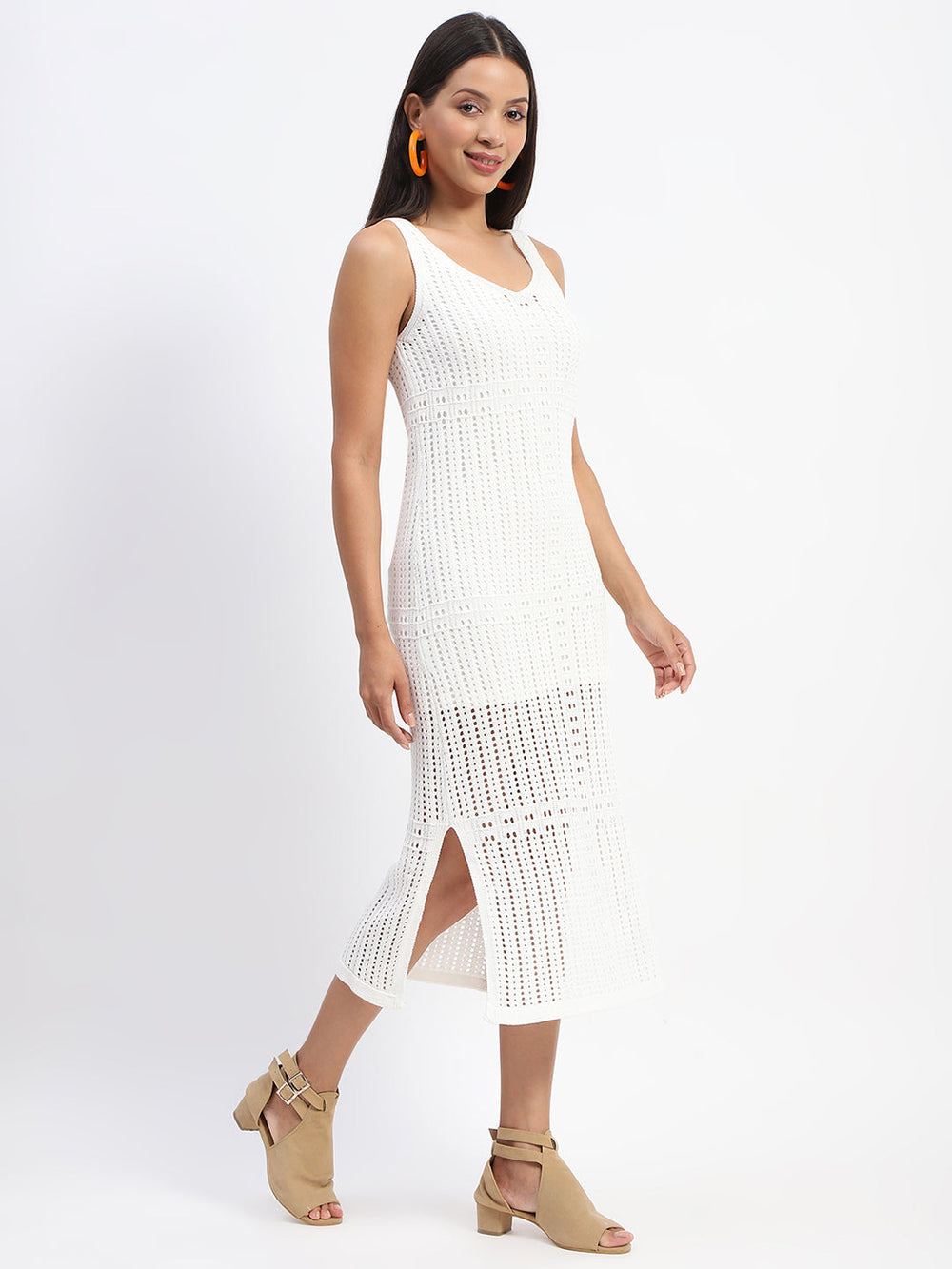 Featuring intricate detailing and a vintage vibe, this elegant off-white knitted dress offers a flattering V-neck and intricate crochet detailing. A perfect choice for both casual and semi-formal occasions. The soft, comfortable fabric ensures a relaxed fit, while the timeless design adds a touch of sophistication to any wardrobe. Pair it with sandals for a daytime look or heels for an evening out.
