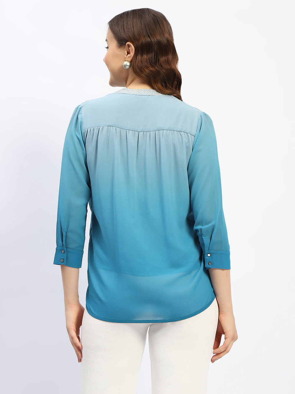 This elegant drape top is a versatile addition to any wardrobe. The Ombre effect creates a stunning gradient from light to dark teal, while the mandarin neck adds a touch of sophistication. The drape detail adds a flattering and flowy silhouette, making it perfect for both casual and formal occasions. Made from high-quality fabric, this top is comfortable to wear and easy to style. Pair it with tailored pants for a more polished ensemble, this top is sure to become a go-to favorite.
