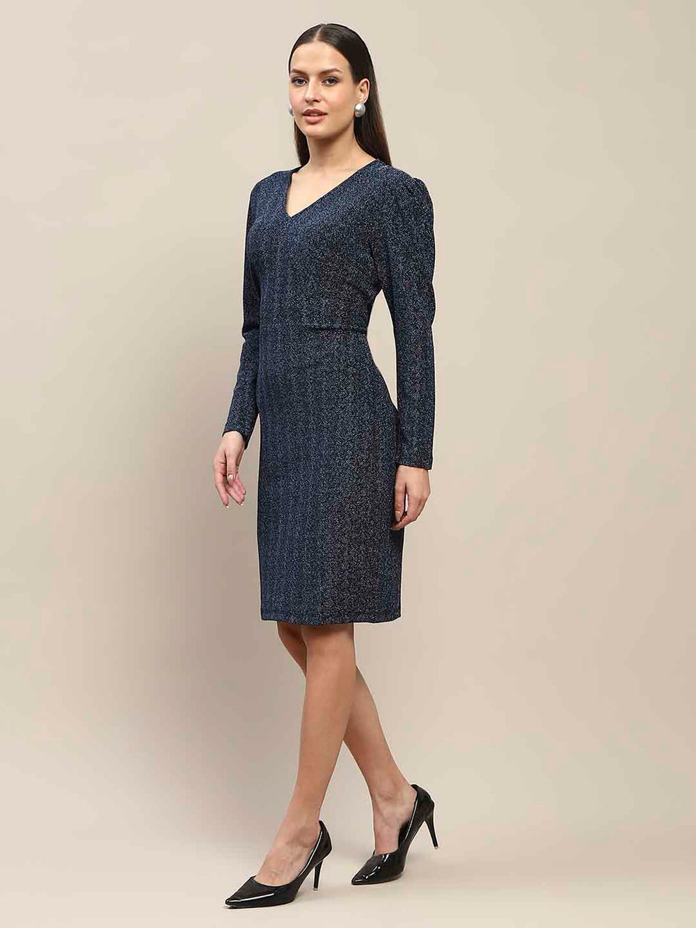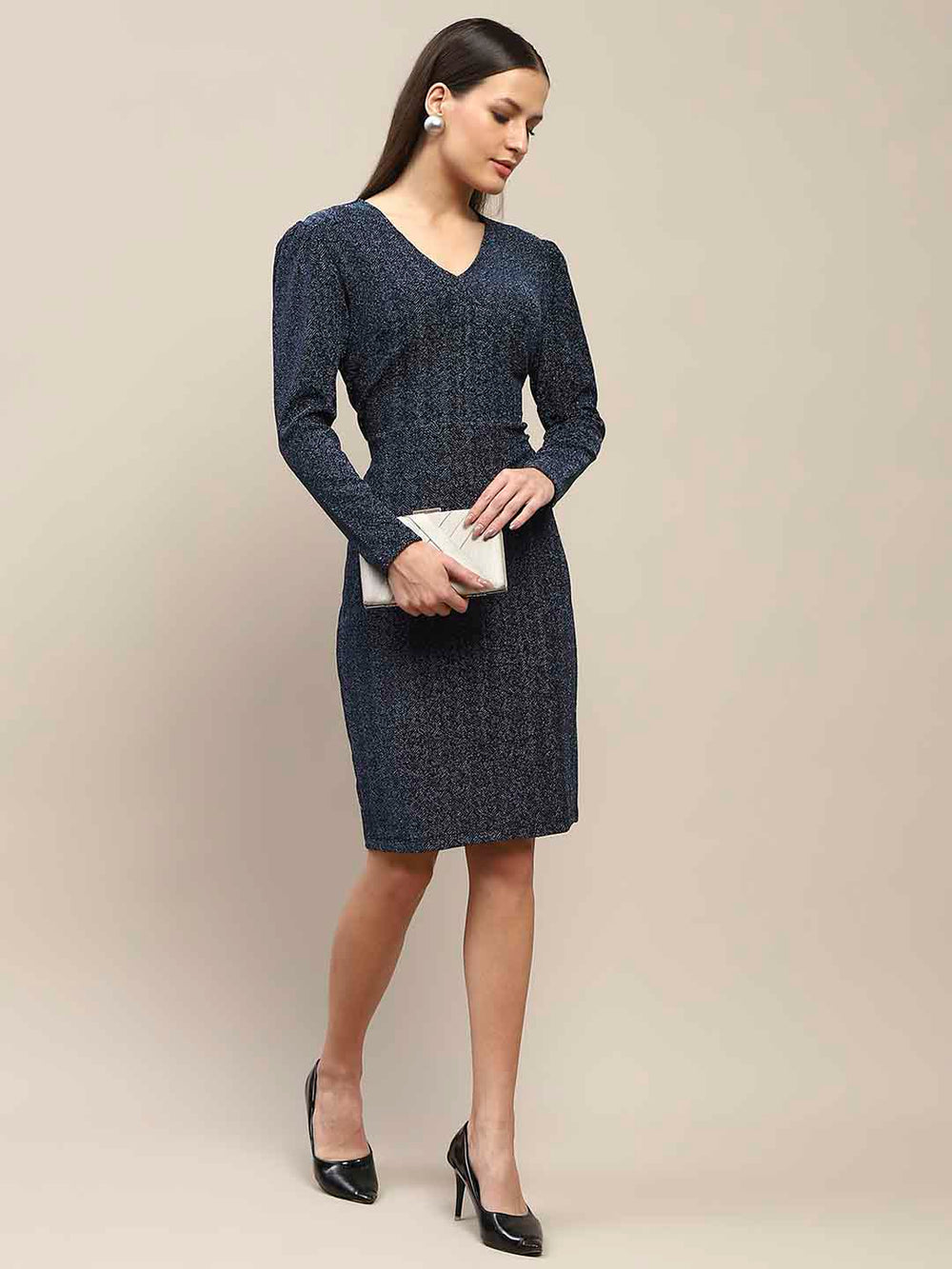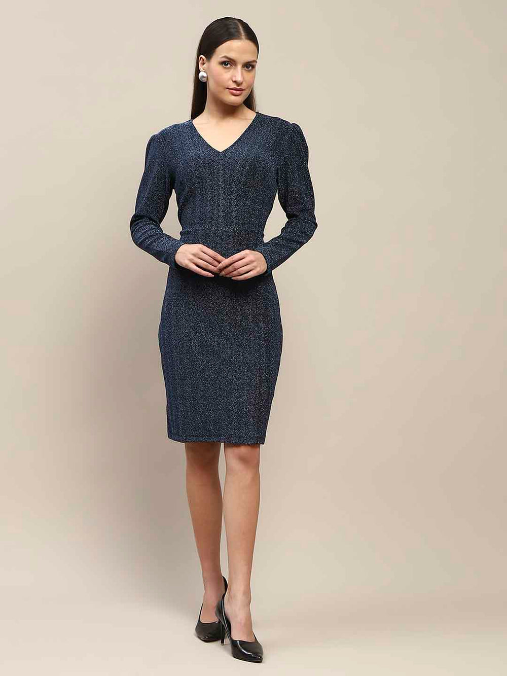 This dress features a unique overlap design that adds a touch of sophistication. The full sleeves provide warmth and coverage, making it an ideal choice. The rich navy color is not only timeless but also versatile. What sets this midi dress apart is its self-design texture, which adds depth and character to the overall look. Pair it with a statement belt to accentuate your waist or layer it with a chic jacket for added flair.