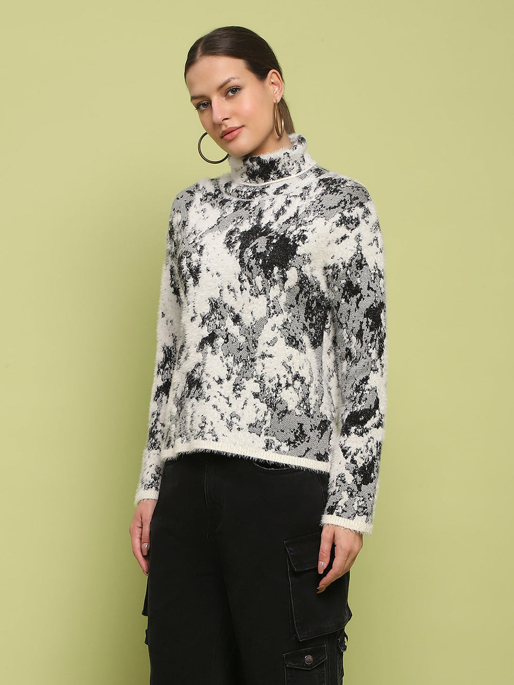 This chic sweater features a unique abstract print that adds a touch of artistic flair, making it a standout piece for any occasion. The off-white color provides a versatile backdrop. Crafted from a soft, high-quality fabric, this sweater not only looks great but feels amazing against your skin. The mock neck design adds a sophisticated twist, offering a bit of extra warmth.