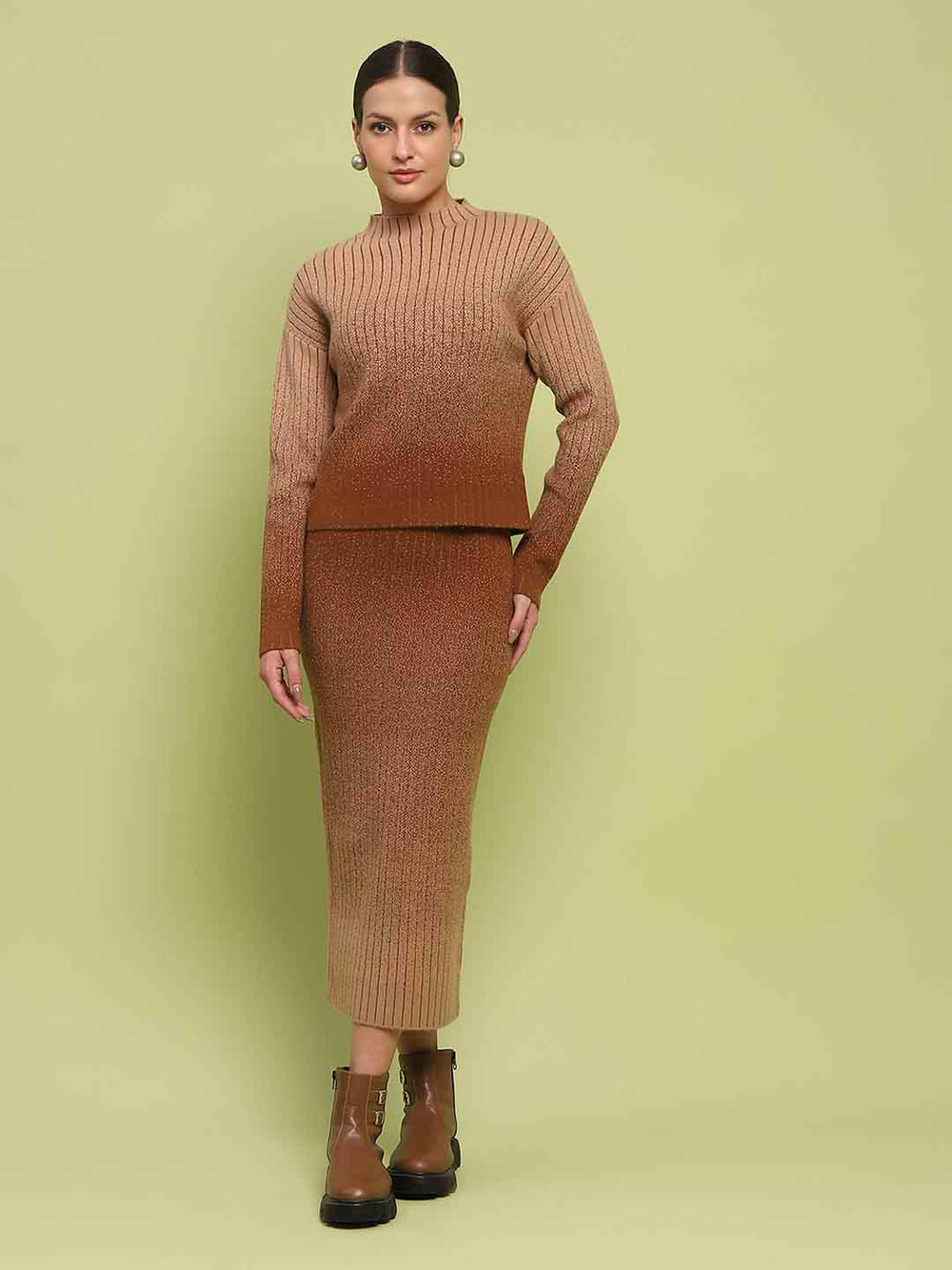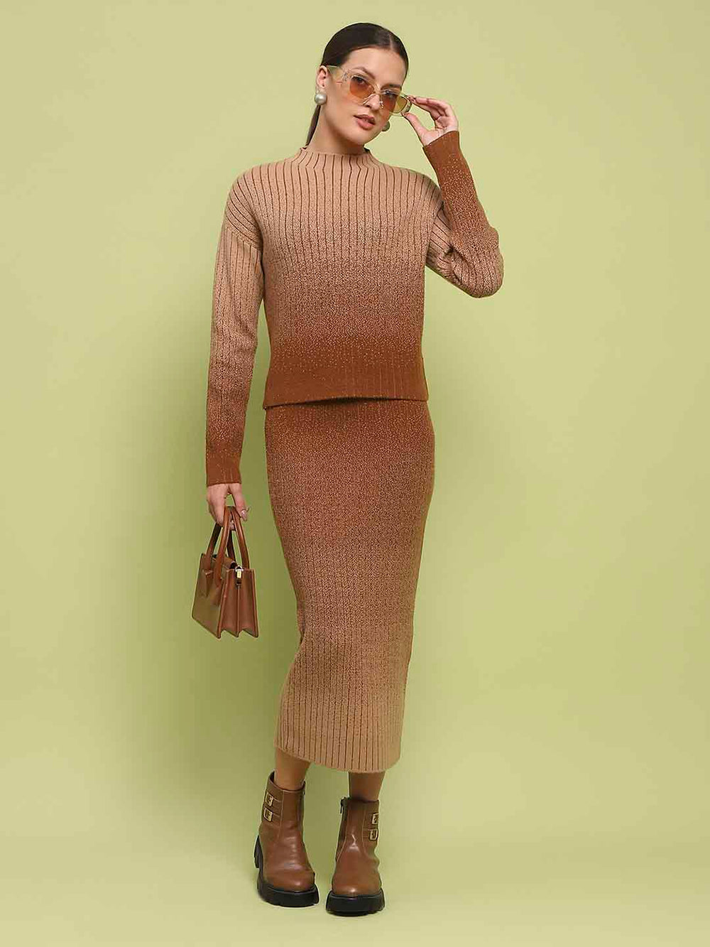 The top features a soft, flowing silhouette that drapes beautifully over the body, showcasing a captivating gradient that transitions from a warm camel hue to a deeper, richer brown tone. This unique color scheme not only adds depth to your look but also makes it incredibly versatile. The subtle details, like the delicate stitching and flattering neckline, elevate the overall aesthetic. The matching skirt completes the ensemble with its chic design.