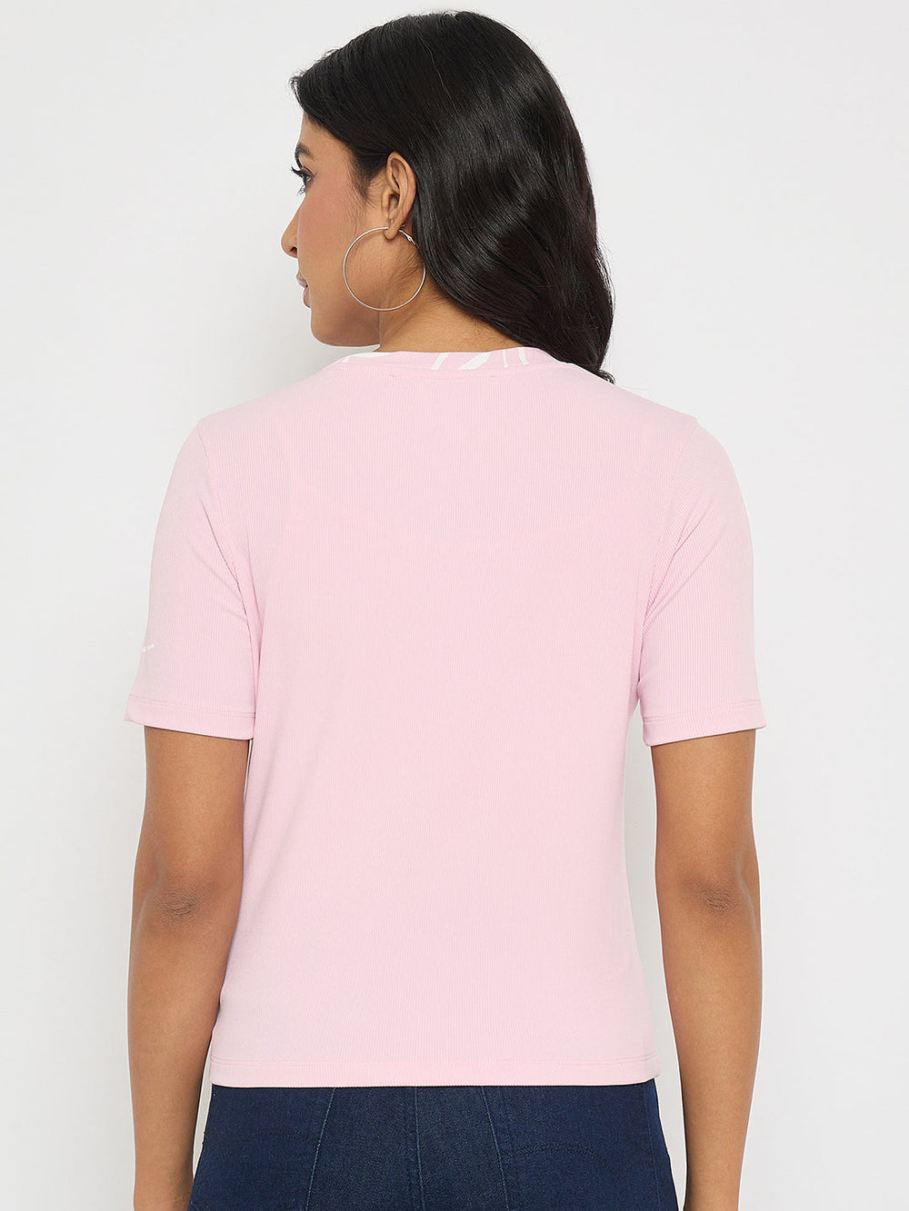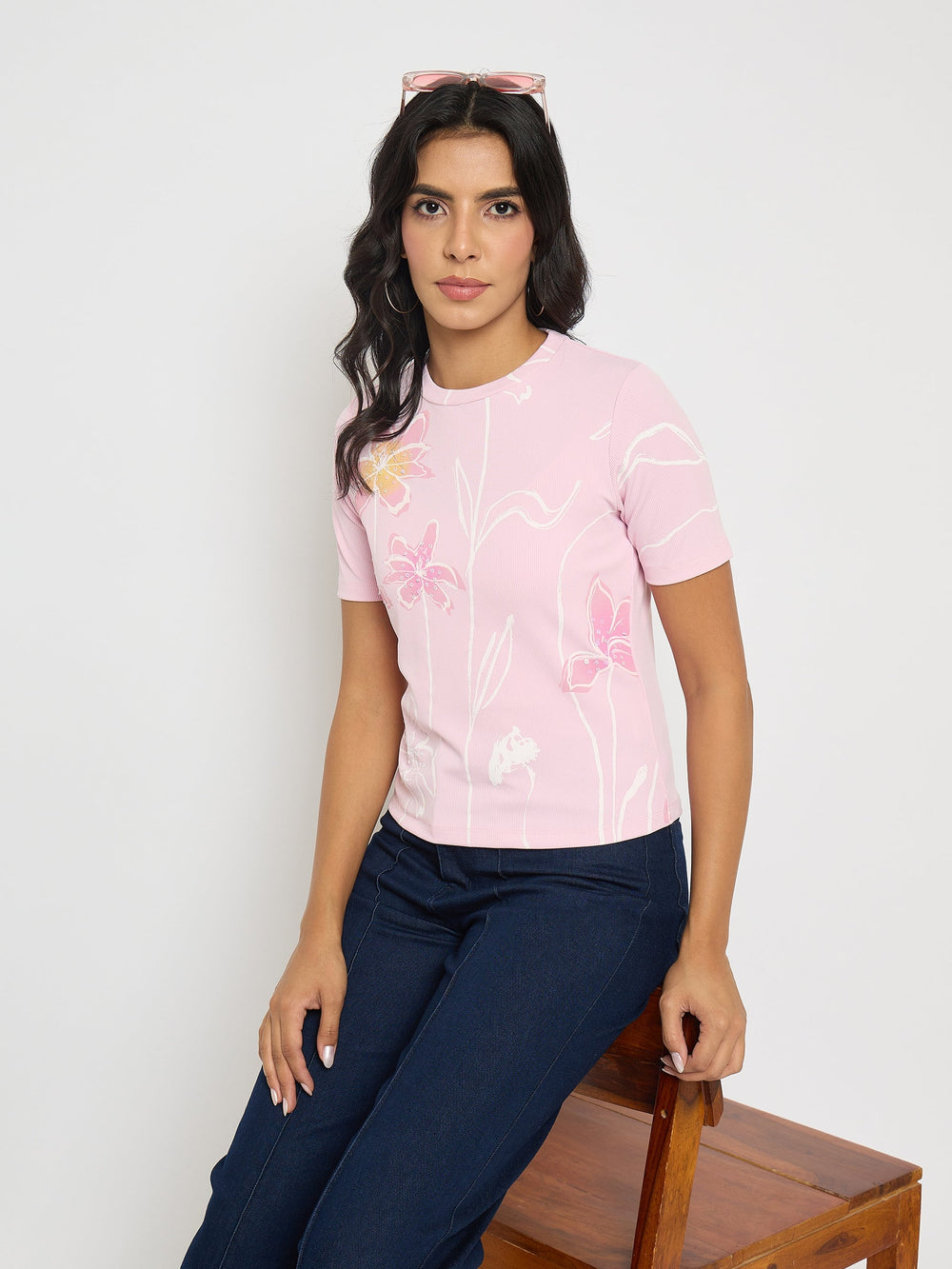 Delicate floral prints and subtle sequin detailing give this pink t-shirt a dreamy, dressy touch. Perfect for brunch dates, casual parties, or festive dinners.