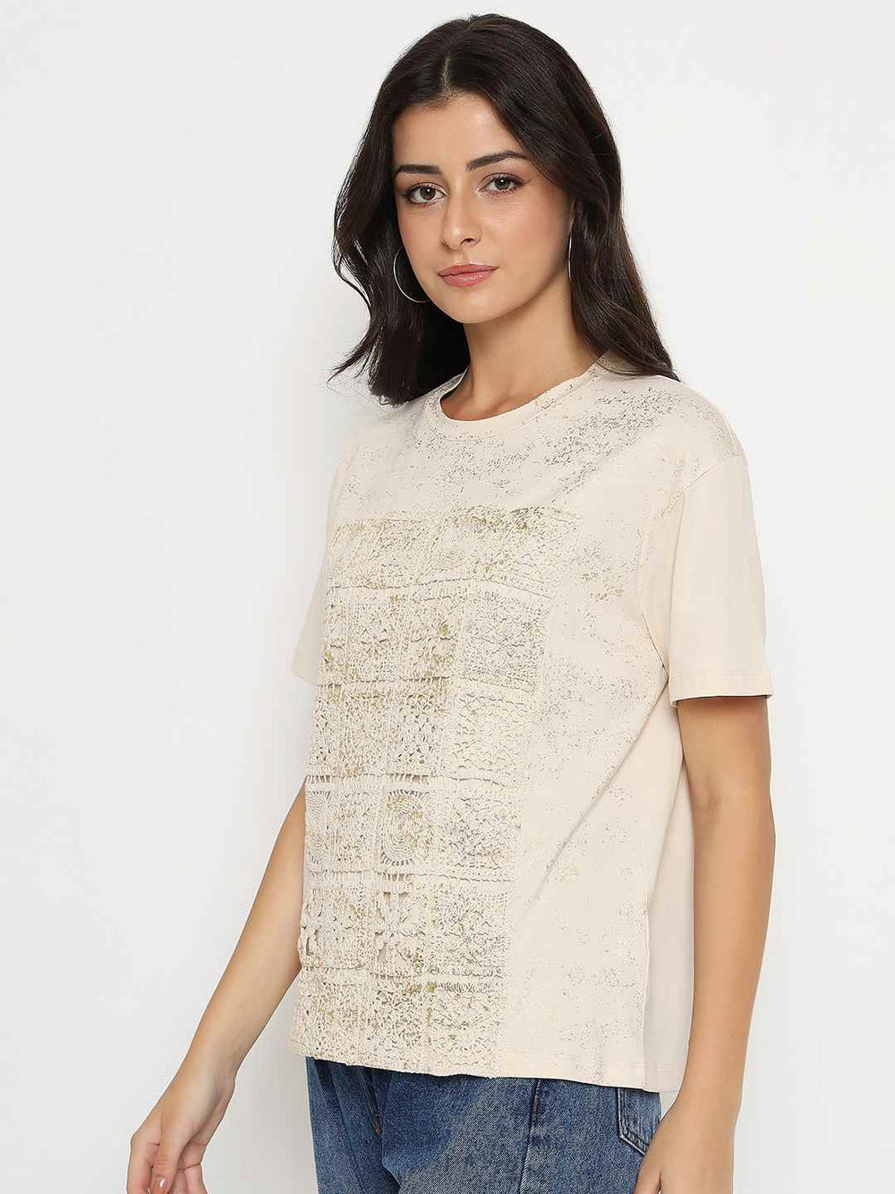 Subtle and refined, this beige T-shirt stands out with unique features with Dori embroidery and a soft finish. Perfect for casual brunches or everyday errands, pair with trousers.