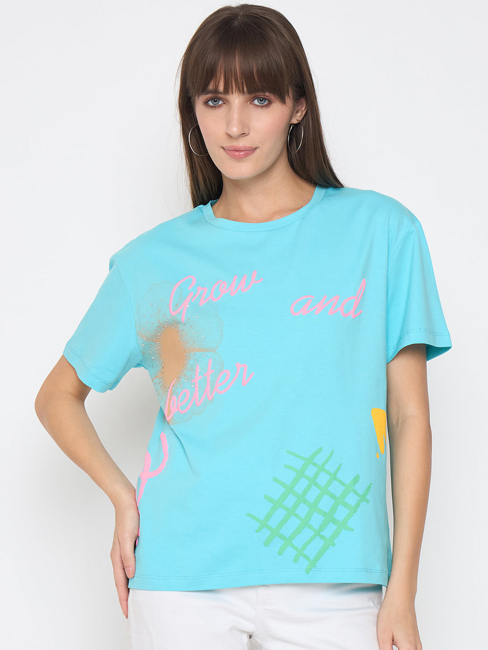 This aqua blue T-shirt is a masterpiece of craftsmanship, featuring exquisite handwork and embroidery that elevate it from simple to stunning. The half sleeves offer a relaxed fit, perfect for warmer days or layering. The intricate details add a touch of artisanal charm, making it an ideal choice for both casual and dressed-up looks. Soft and breathable, this T-shirt brings a fresh pop of color and unique flair to your wardrobe, effortlessly blending comfort with creativity.