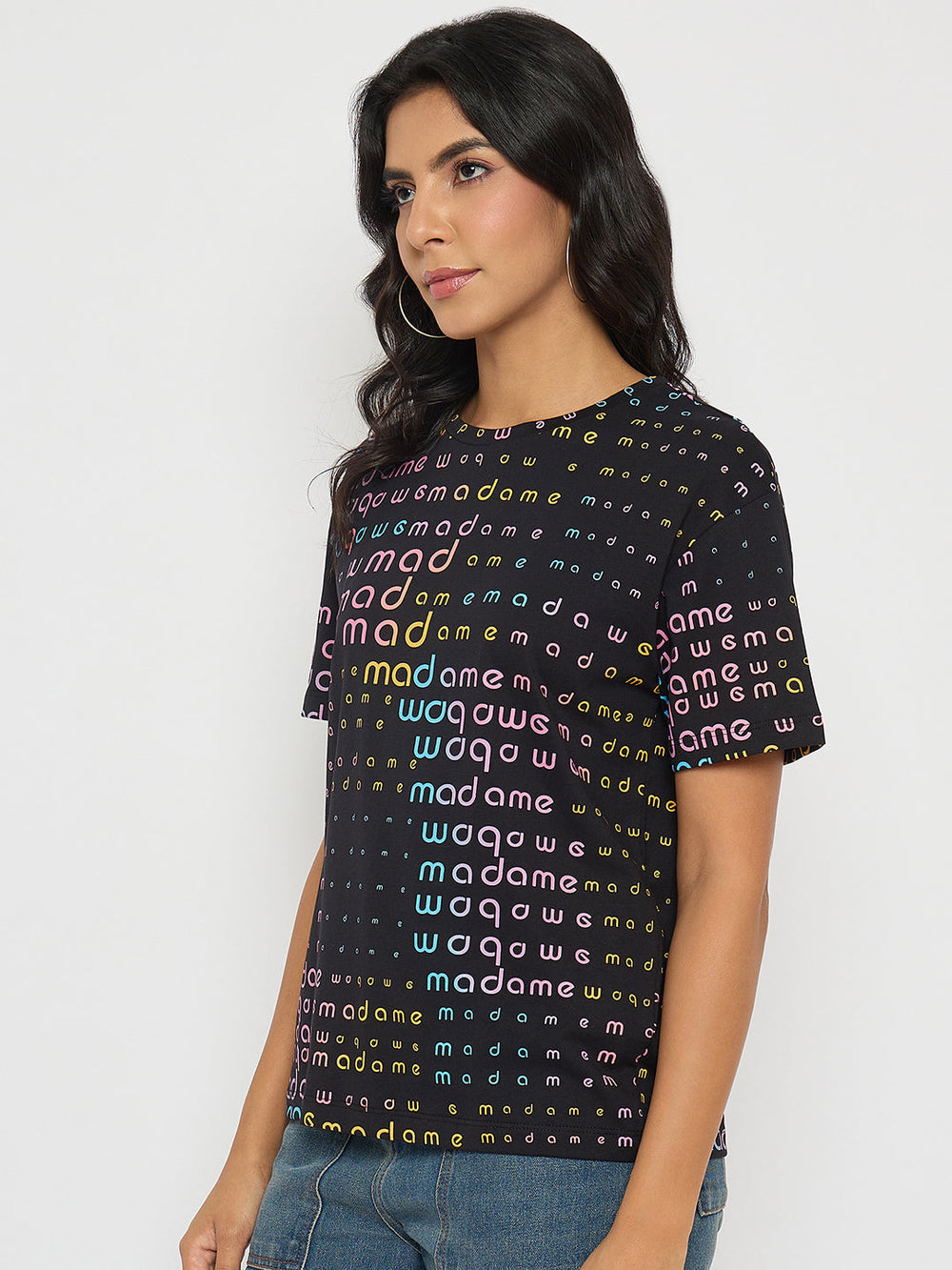 Make a statement with this black tee featuring an all-over print. Soft and edgy, perfect for casual days or concerts. Pair with denims or cargo pants for impact.