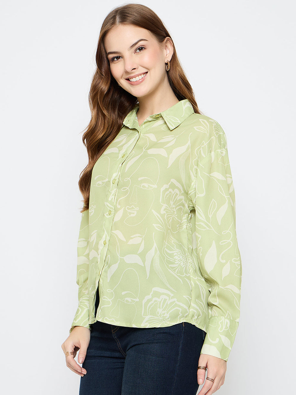 Breezy and elegant, this green shirt is adorned with delicate floral prints and finished with smart cuff sleeves. Ideal for workdays or coffee catch-ups, it blends polish with playful charm.