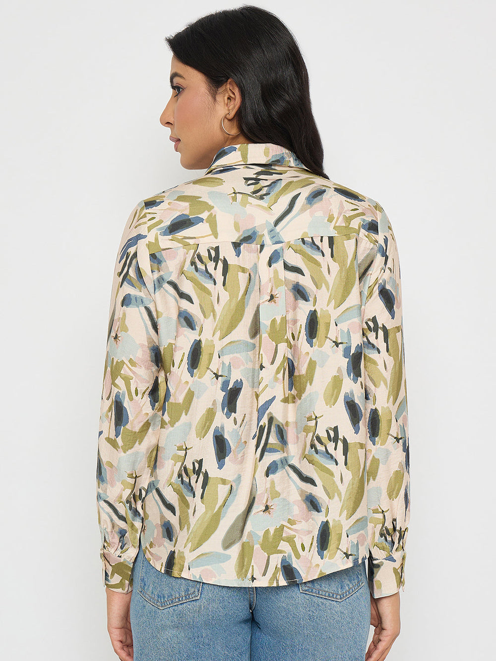 Featuring a striking abstract print on a breathable rayon blend, this olive green shirt blends artistic flair with relaxed sophistication for effortless styling.