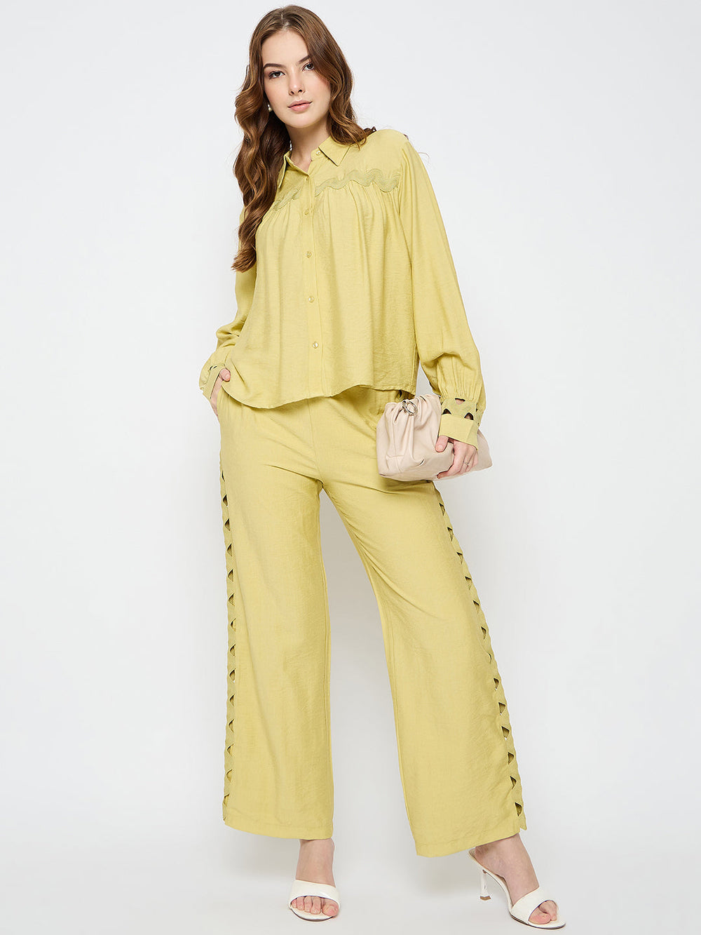 Fresh apple green with lace accents and sleek bottoms. It is a coordinated blend of crisp tailoring and delicate lace for everyday wear.