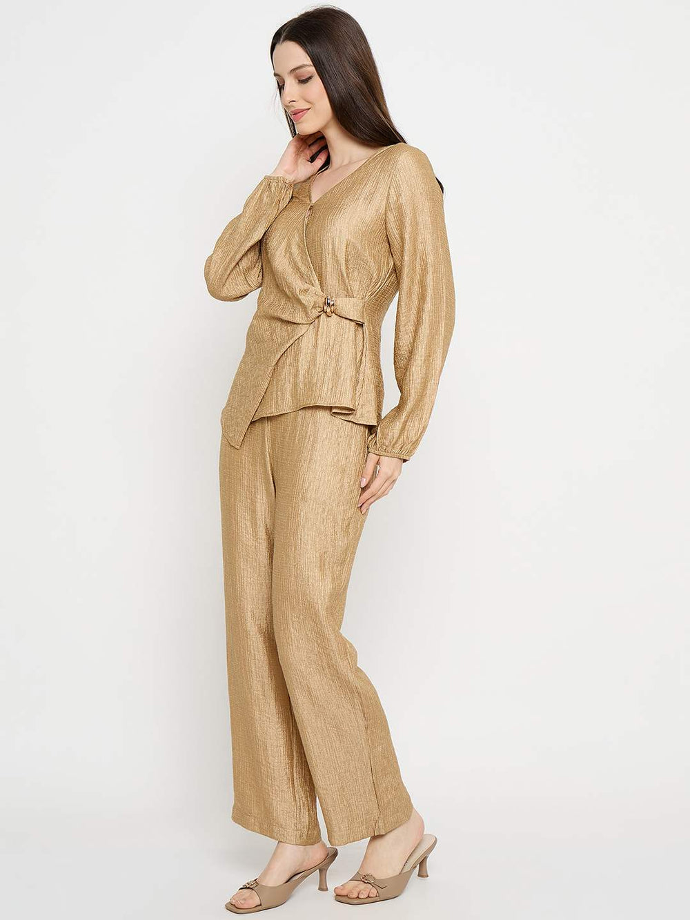 Made for days that call for elegance, this golden coord set features a playful tie-knot top and straight-fit bottoms, a blend of charm and flair for any casual outing.