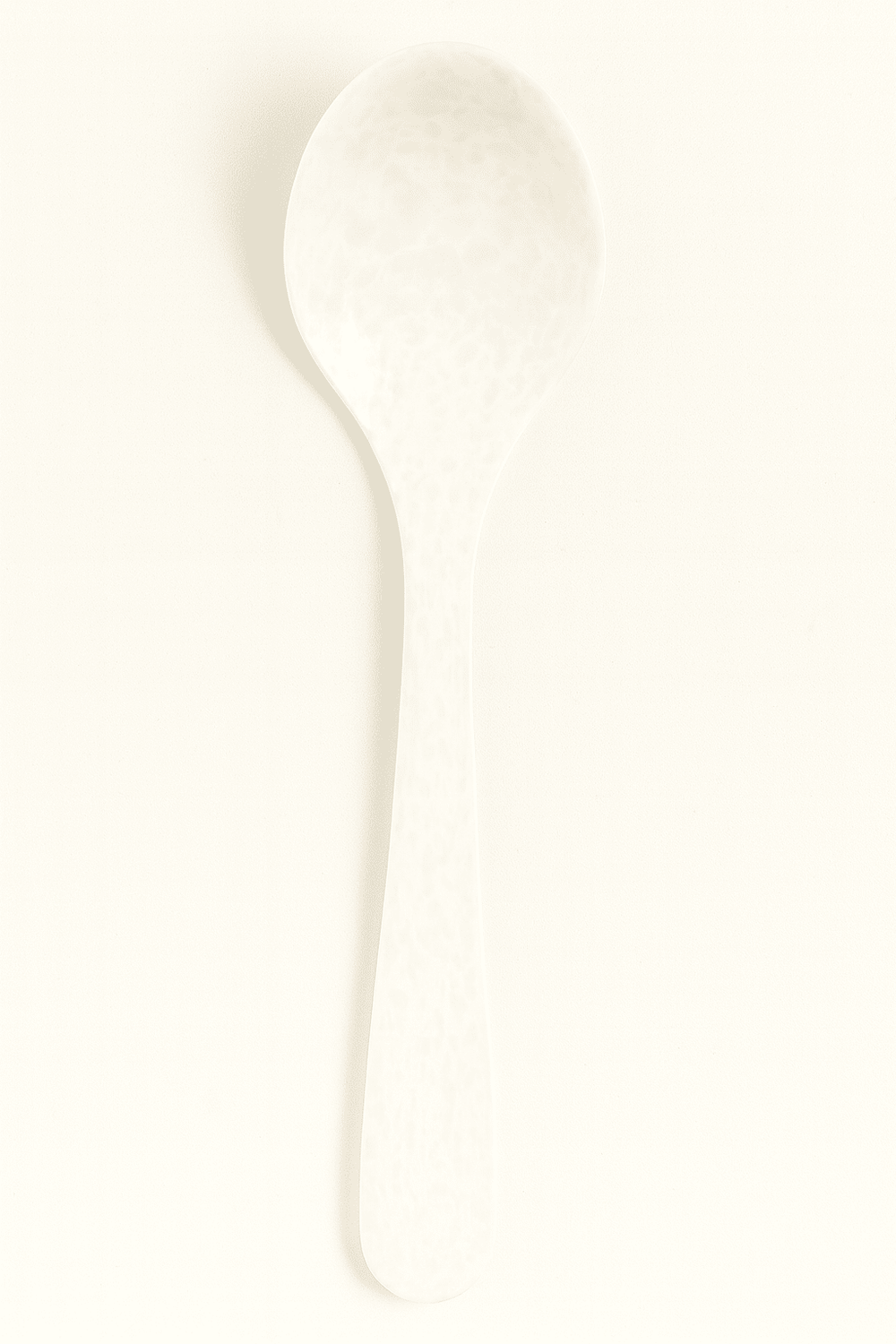 This is a white melamine serving spoon, designed for daily dining and kitchen use. It features a smooth, glossy finish with a subtle marble-like texture, giving it an elegant appearance. The spoon has a broad, oval-shaped bowl suitable for serving rice, curries, soups, or gravies, and a long, sturdy handle for easy grip and handling.