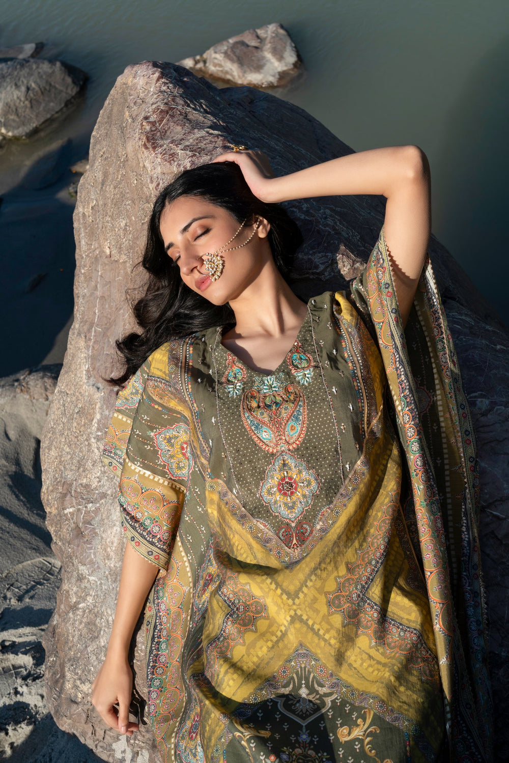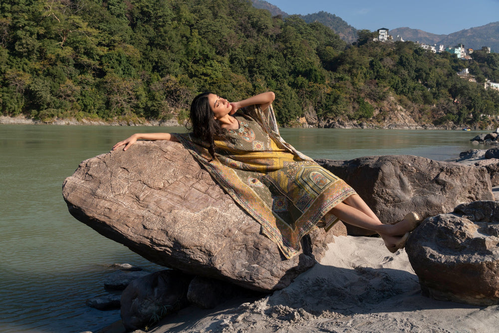 Celebrate the harmony of tradition and style with this enchanting mehendi green kaftan. The flowing viscose modal fabric feels as graceful as it looks, adorned with intricate digital prints that tell a story of artistry. Highlighted by delicate handwork, this kaftan captures the spirit of celebrations and serene moments alike. The mehendi green shade evokes nature's elegance, making it ideal for festive evenings or tranquil gatherings.