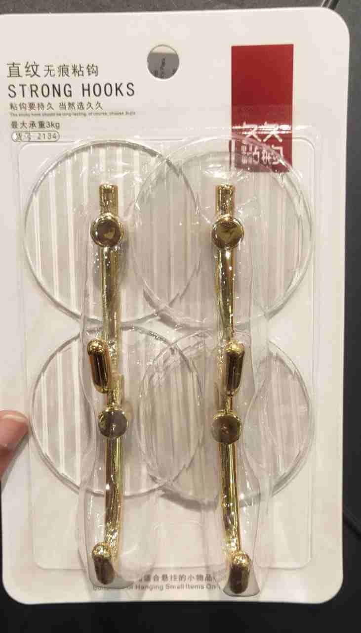 This is a pack of Strong Adhesive Hooks (Model 2134), designed for convenient household organization. The set includes two long gold-finished hooks, each mounted on a transparent round adhesive base. The elegant golden design adds a touch of luxury, making them suitable for modern interiors.