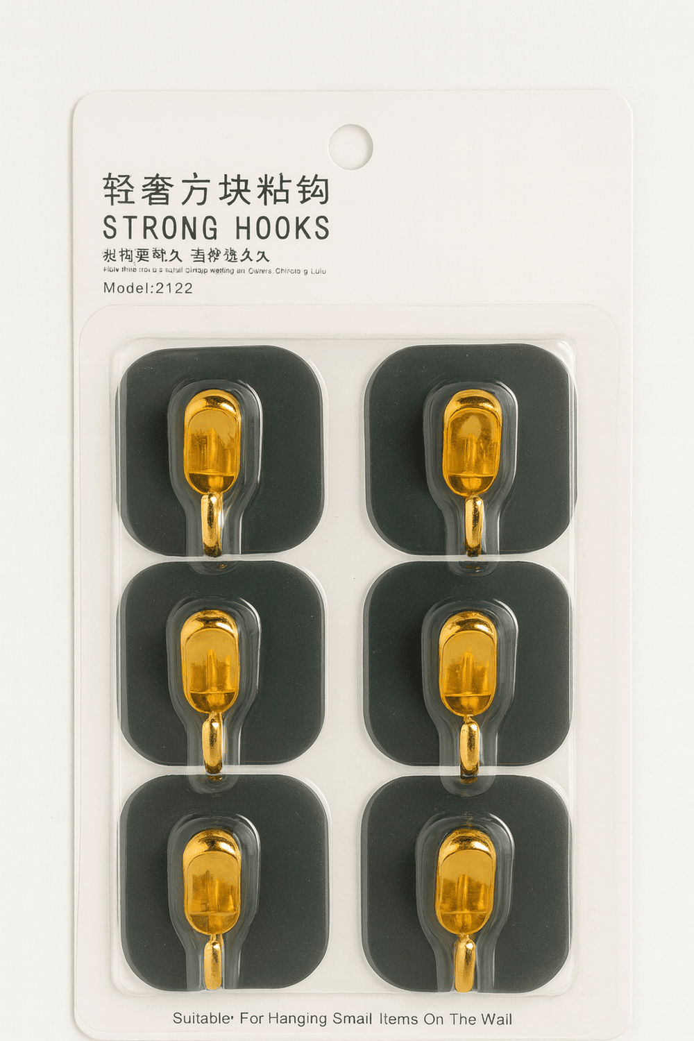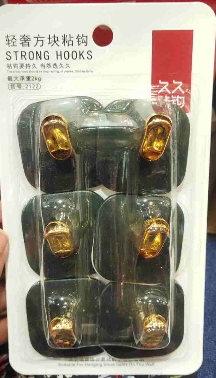 This is a pack of Strong Adhesive Hooks (Model 2122) designed for multipurpose household organization. The set contains six compact hooks with a gold-plated finish, each mounted on a dark gray square adhesive base.