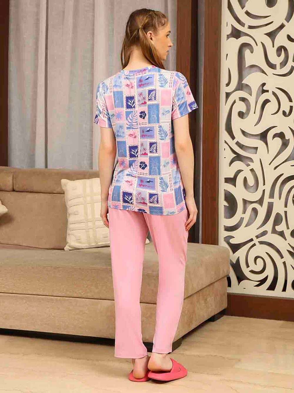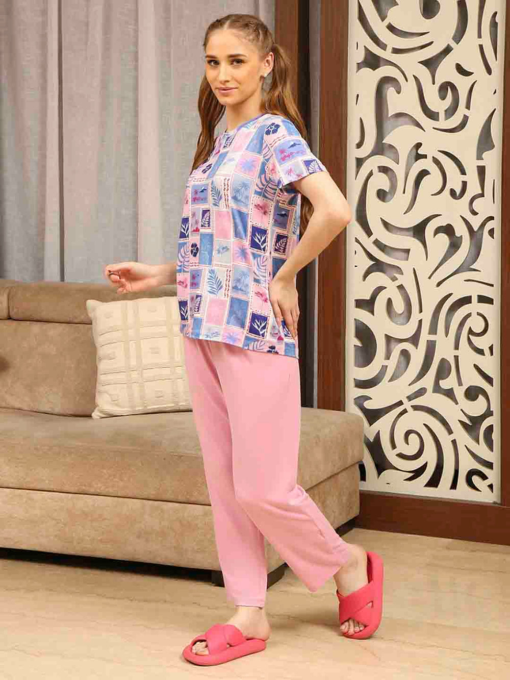 This pink nightsuit features a charming botanical print top paired with solid bottoms. Soft and breathable, it's ideal for movie nights or cozy weekend lounging.