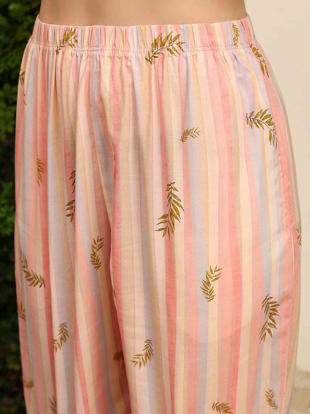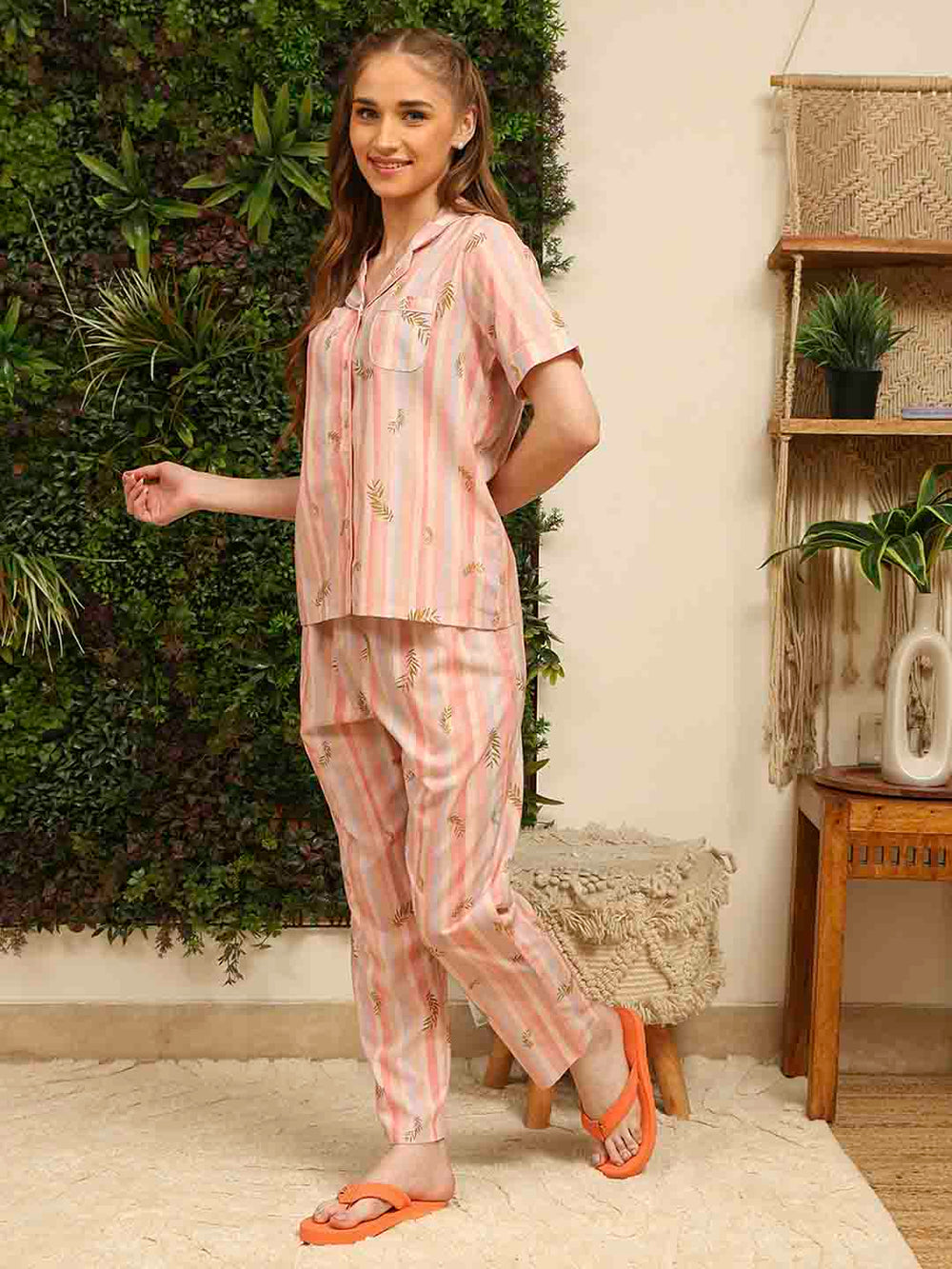 This cloudy soft peach night suit features a striped top and bottoms for a breezy, breathable feel. Perfect for lounging in style or curling up with a good book.