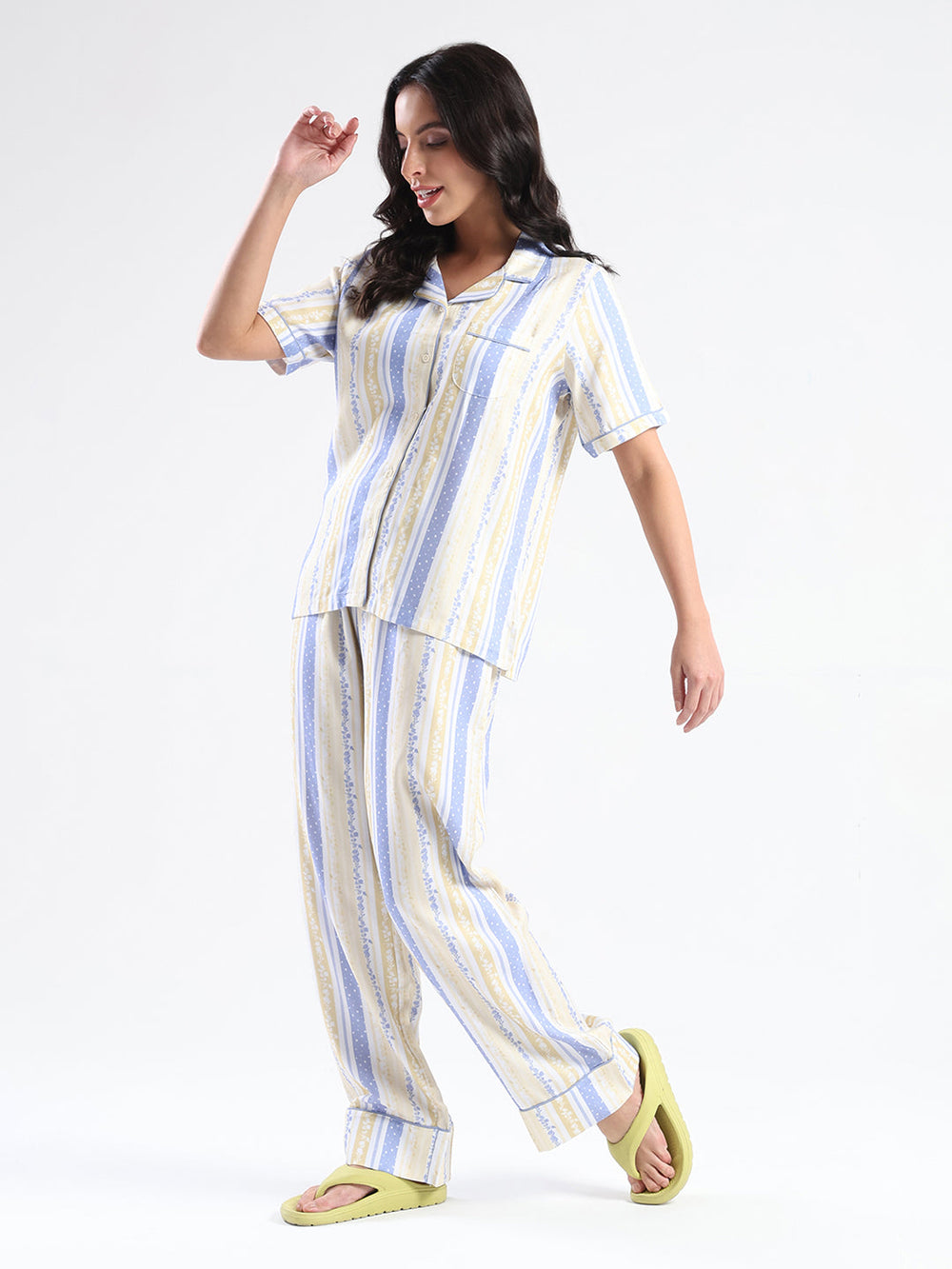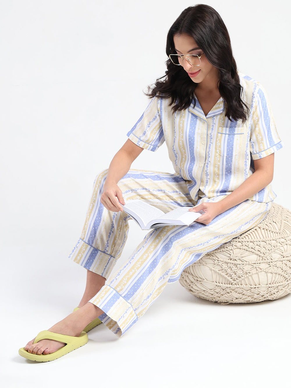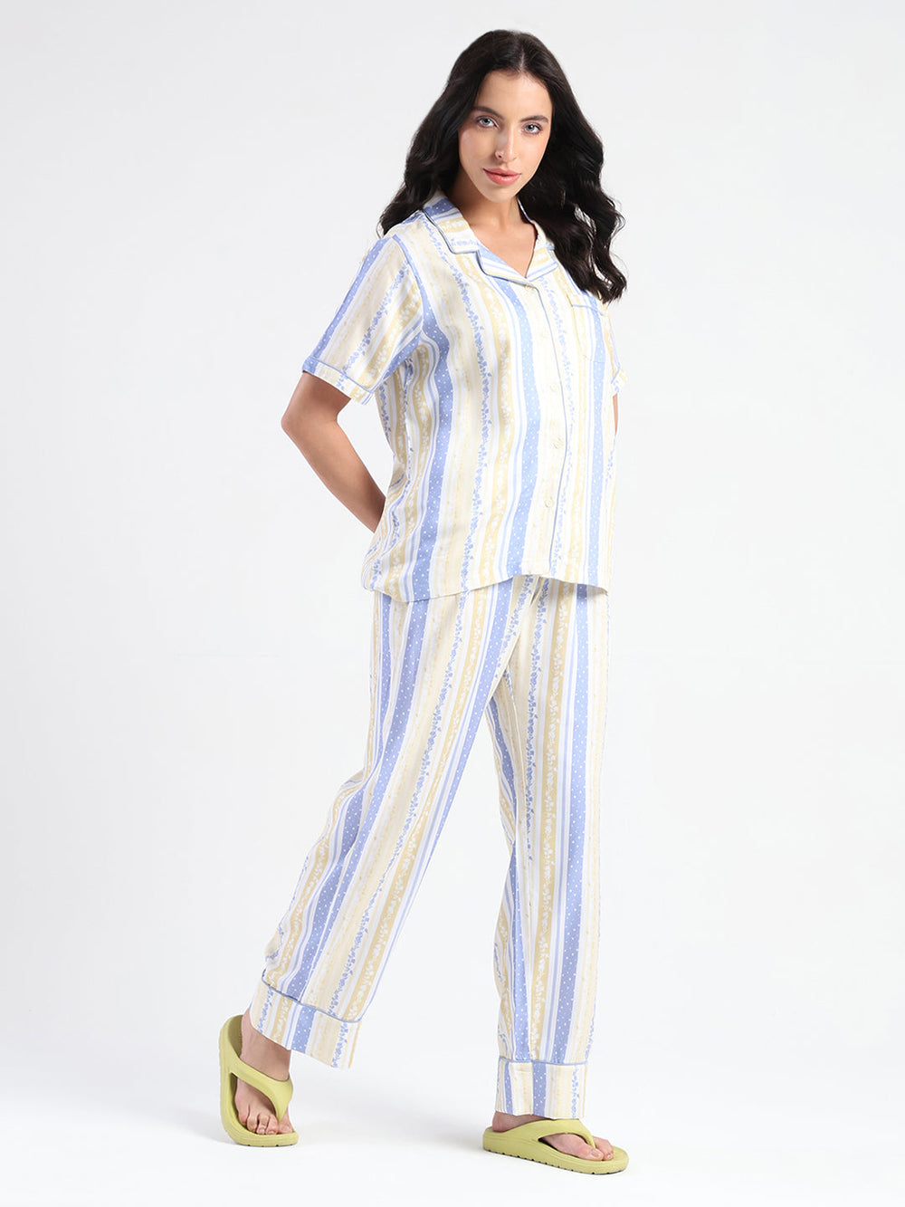 Yellow striped nightsuit in soft viscose, featuring a collared top and matching bottoms. Lightweight, breathable, and perfect for a cozy yet cool bedtime look.