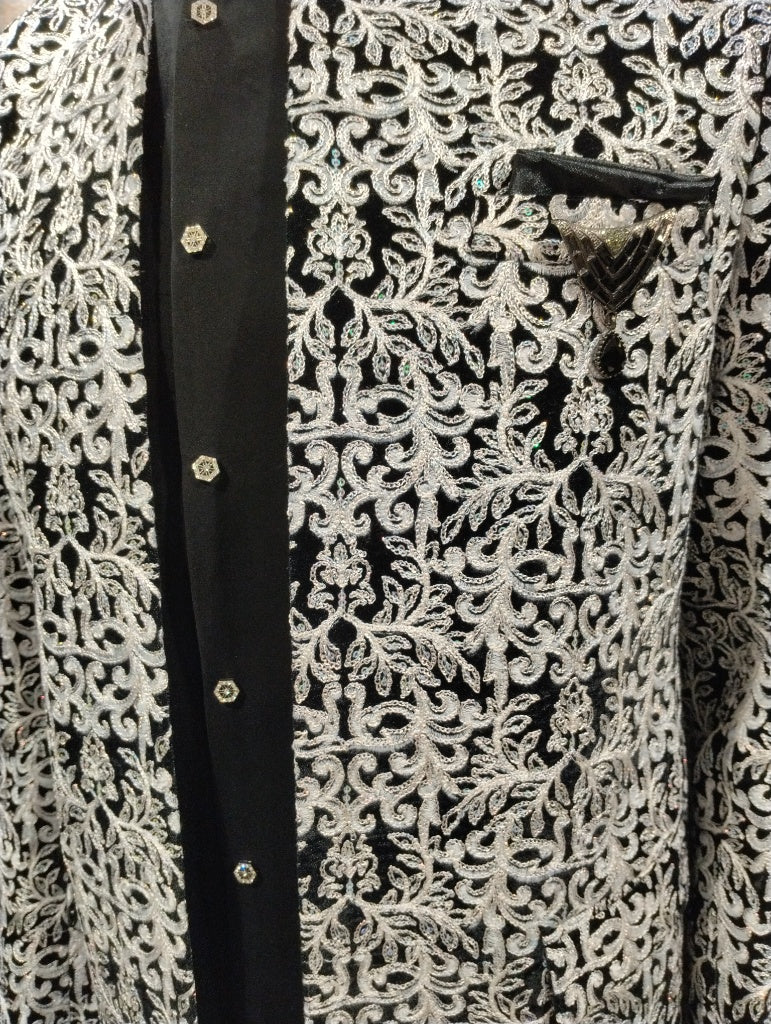 Command attention in this luxurious Black Velvet Jodhpuri Suit. Crafted from rich black velvet, the jacket features intricate heavy silver and white thread embroidery in a dense floral and botanical motif that covers the entire surface. This dazzling metallic work ensures maximum shine and luxury, making it the ultimate statement piece for evening wedding receptions, formal parties, and red-carpet events. Paired perfectly with a matching black inner kurta/vest and trousers, this suit embodies sophisticated, contemporary royalty.